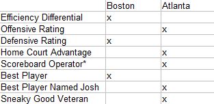 You might think the Celtics, the old veteran team, would have the Sneaky Good Veteran advantage, but Tracy McGrady in 10-20 minutes a game is putting up a 16/8/6 per 48 minute line. Who knows what could happen when you combine the Atlanta Home Scorekeeper with a guy who can do this: